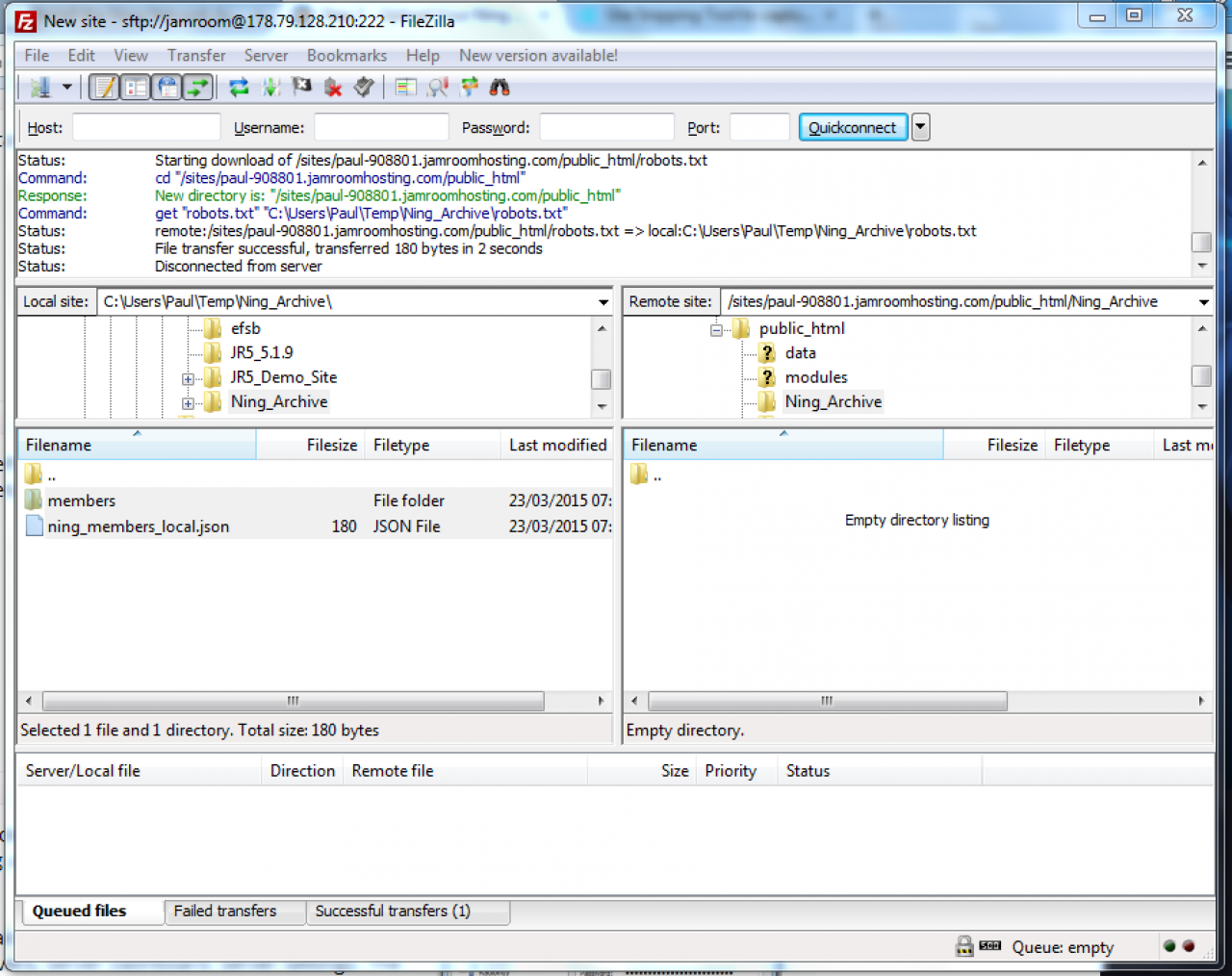 Select all of the archive files and folders in the local (left hand) pane (use Ctrl-A for quicknesss) then drag and drop them into the empty server (right hand) pane. That's it. Sit back and watch it happen. If you have a large archive this process could take a while, but you can check its progress at any time by looking at the info along the bottom of the Filezilla pane.