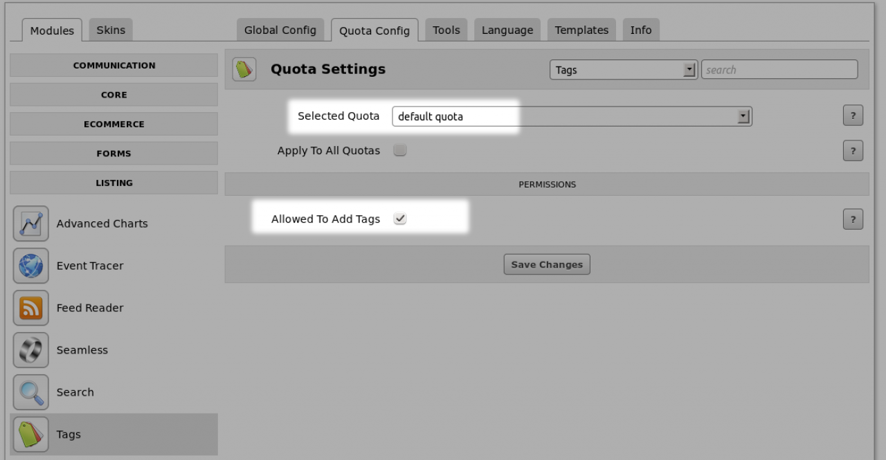 Now that your skins templates have the necessary code in them to add tags and display the tag clouds, its time to allow users of a quota to start tagging stuff.