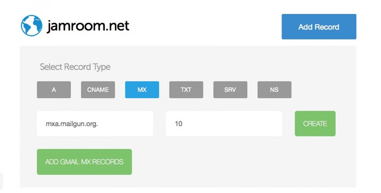 Next, click on the big blue "Add Record" button in the upper right corner, and choose "MX" as the record type: