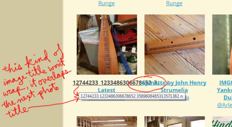 The names they are choosing for both images AND galleries are often waaaay too long and causing overlap and/or just are plain annoying. One member recently titled his new Gallery (consisting of ONE photo): "Small Herd Of Elk (Wapiti) Taken At 7:00 A.M. On April 12. 2016 Just East Of My House With My I Phone" Um, yikes...!