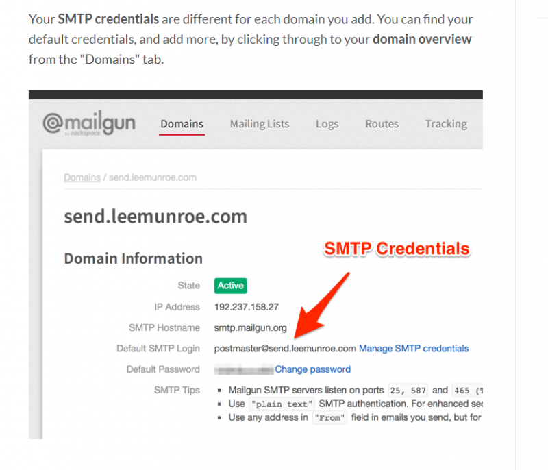 Here's a screenshot from the Mailgun Help blog showing the SMTP settings area I'm talking about, and mine has a setting both for my main @fotmd.com email and also "postmaster@___". I'm not sure whether those PWs need to be the same as my Mailgun Account main PW, and/or do they need to be the same as _WHICH_ PWs on my Jamroom end? Do I find the PWs for those items on my Jamroom settings and need to update them?