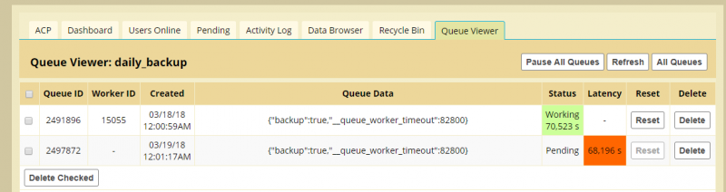 For some time now off and on, but happening almost constantly now, when i go to my dashboard's Queue Viewer I keep seeing the Daily Backup and hourly Backups seemingly 'stuck' or sleeping for long periods of time. Please see these two recent screenshots as examples.