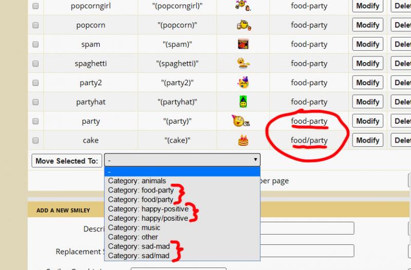 The things is, I figured I'd try deleting one or both of one set of twin categ's, so I emptied all the smileys from that pair of cat's into the Default cat., planning to then delete both instances of the category and create it again fresh...but I can't find how to DELETE a category once it's been created either- even when it's emptied out...?