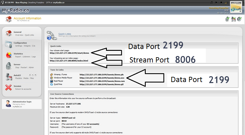To resolve this just log in to your centovacast panel and look at the picture i have included. Match port numbers with your skin configuration panel.