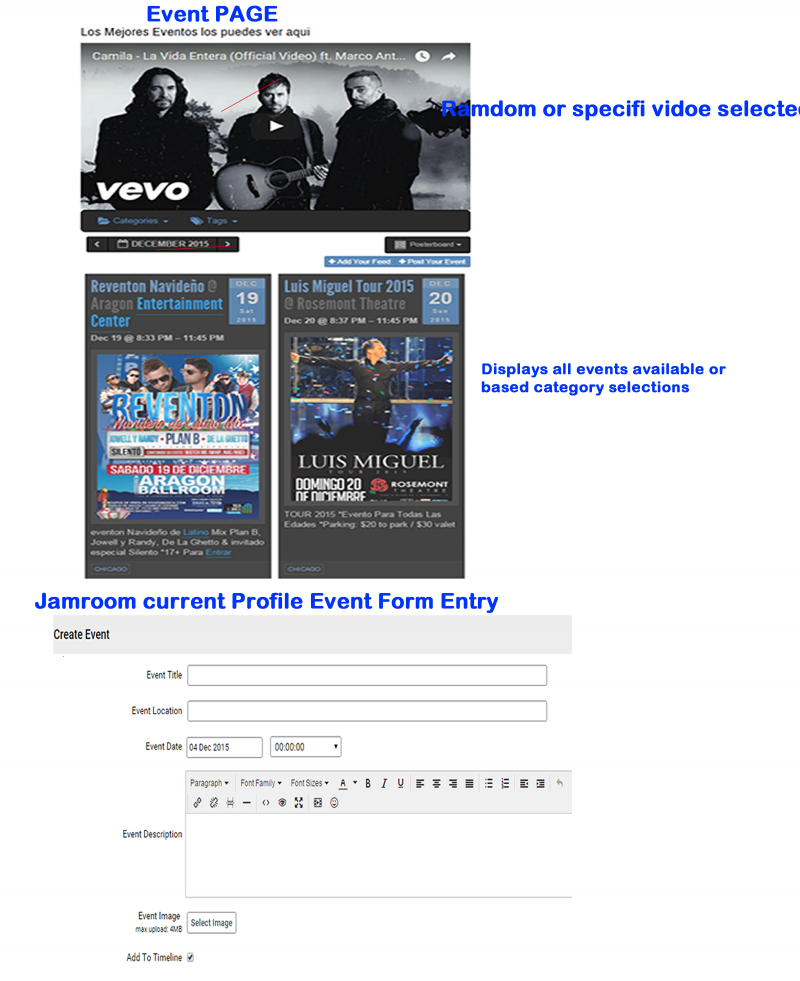 @Luis456 - Have looked at the new images. What you want is doable by using the Form Designer and the UltraJam Google Maps module, as mentioned above. Jamroom modules are designed to be initially simple so as to allow users to use the Form Designer to add the features they want. For example, another user might not want promoter detail fields as you do, so if they were there by default, it would make the module unsuitable for other users. You also say that the event page layout is too simple. Again, this is by design as the template(s) controlling the layout are available for you to modify however you want.