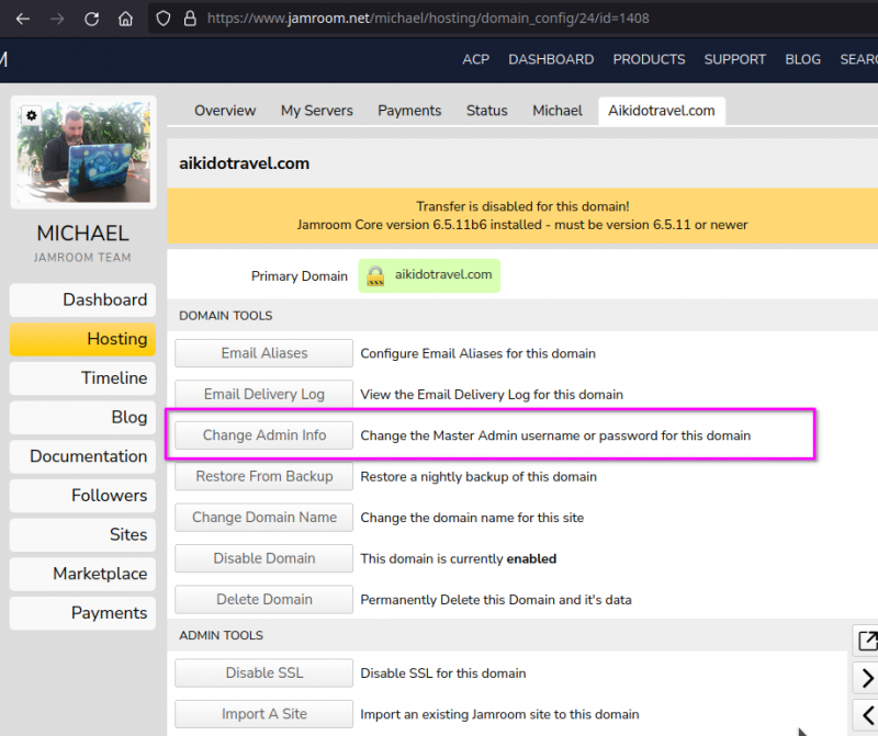 HOSTING -> SERVER DASHBOARD -> SETTINGS -> CHANGE ADMIN INFO