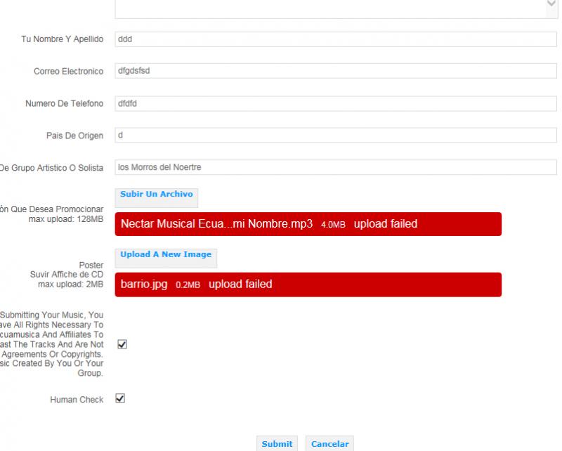 The main idea of this form is to allow A signer or promoter to upload a promotional song without having to create an account profile. How can this be fixed?