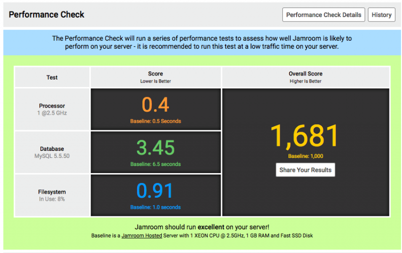 On my Jamroom hosted server the scores are all lower than the baseline (as they are higher performing), and the Overall Score is also higher than the baseline (as expected for a higher performing server).