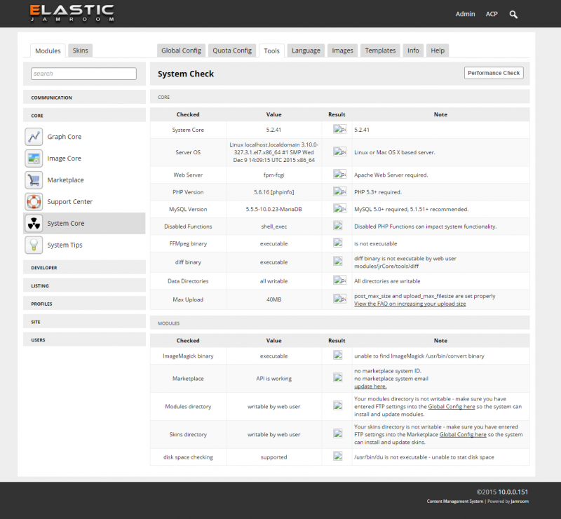 https://10.0.0.151/core/system_check "System Check" page - see output below.