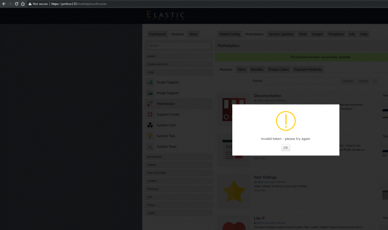 It appears that the issue is between my server's marketplace and the JR server checking if I have a license for XXX paid module. The paid module does show "have a license" but when I try to install, I get invalid token.