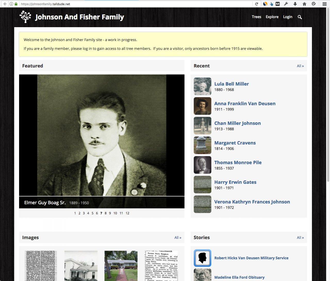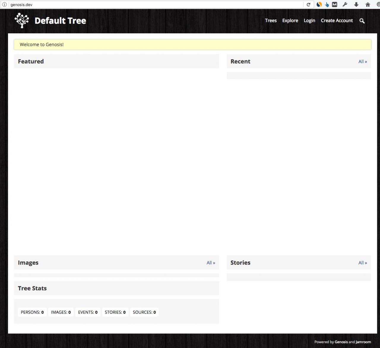 Once you have setup your admin account and imported a GEDCOM file or created the profiles on the site your system front page will look a lot more interesting.