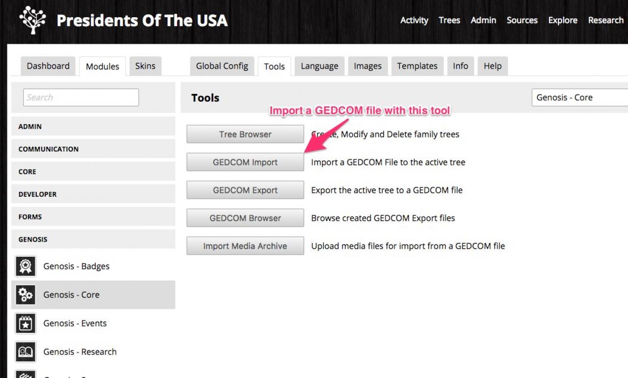 screenshot of the TREE TOOLS, the location to access the GEDCOM importer