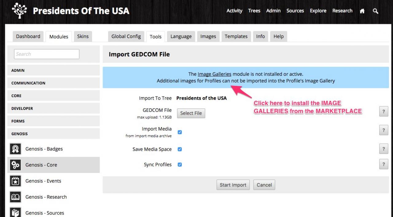 and your GEDCOM file does contain links to images that exist online somewhere that you want to bring into your system, you can install the IMAGE GALLERIES module from the marketplace using this method: