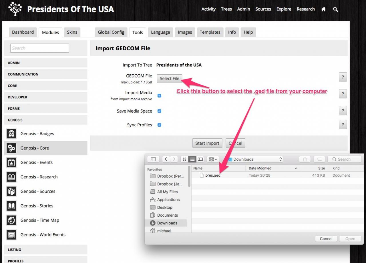 Screenshot of the steps to select the .ged file from your computer