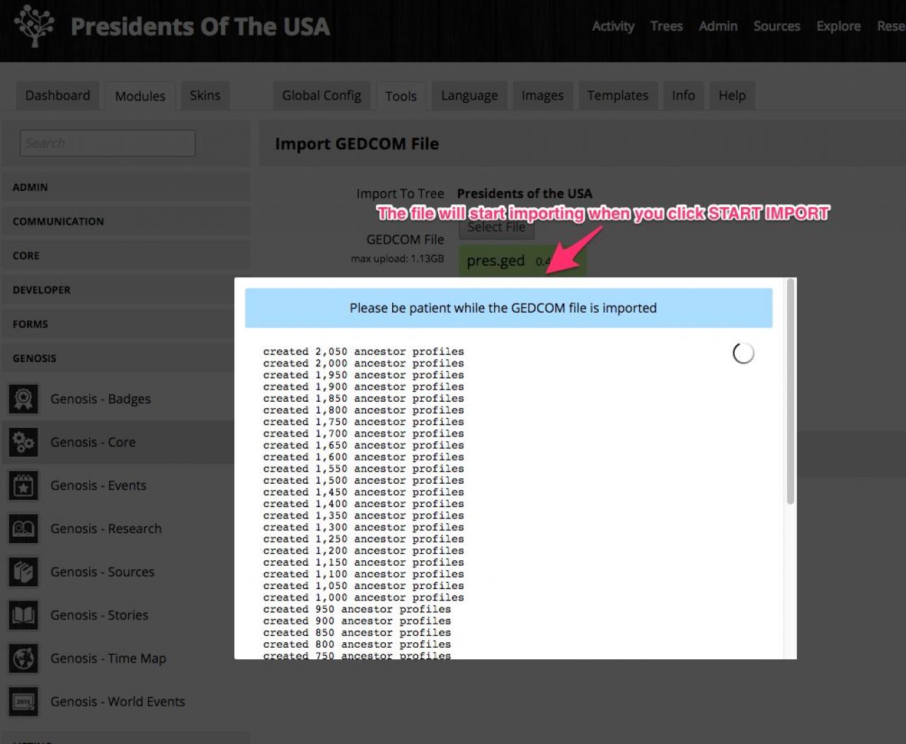 be patient while the .ged file imports