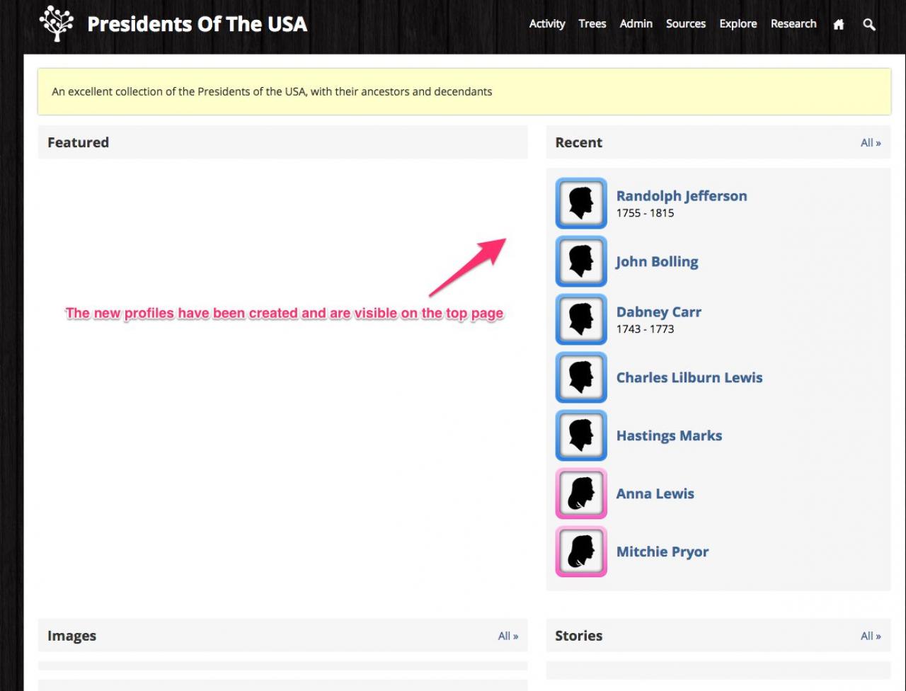 If there were no images URL's in the GEDCOM file there will be no images to display on the front page, but as you start to add images to the profile the front page image display section will populate.