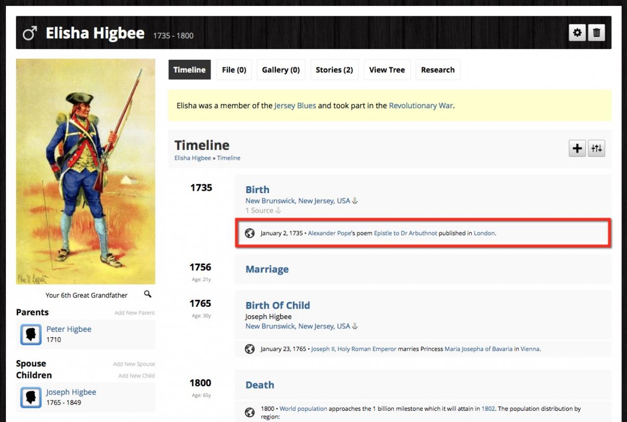 The Genosis World Events module adds significant "World Events" to your Genosis profile time line. The World Events module will import relevant Wikipedia events, and insert links to them in your Profile Time Line: