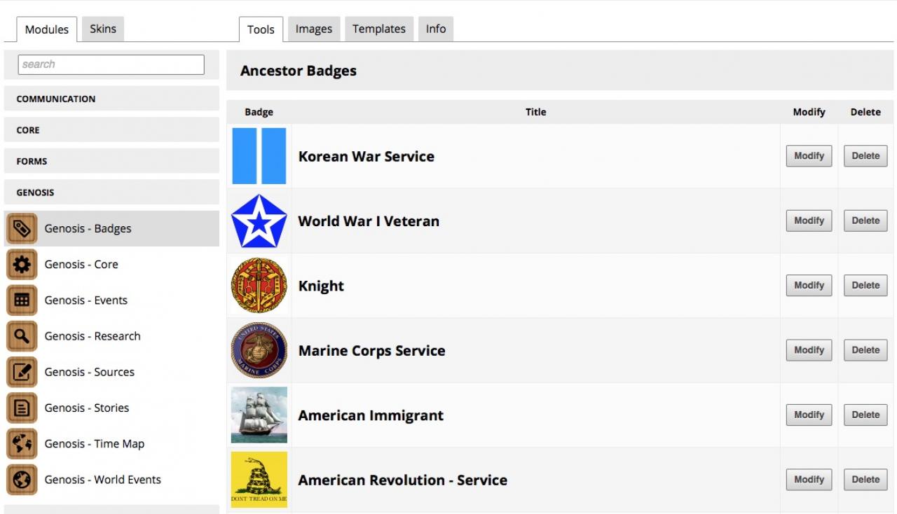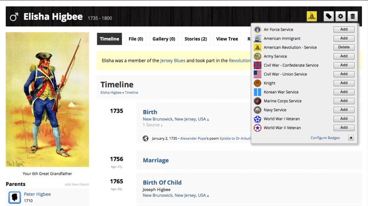 The Genosis Badges module makes it easy to add "badges" to your Ancestor profiles. Want to mark Ancestor profiles that served in the military? Or ancestors that immigrated to the US? Create badges to add extra info to your Ancestor profiles!