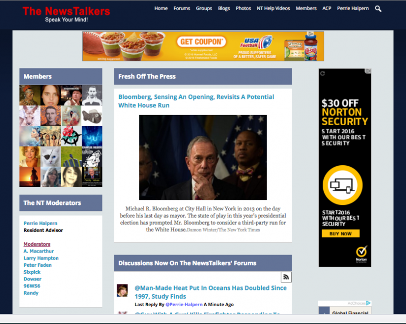 The NewsTalkers is a news and politics discussion forum.We are a nonpartisan site and represent the full spectrum of views. Articles from across the web, as well as original member commentary, are brought here for in depth discussion and debate. NewsTalkers' forum is fully moderated, for the best personal experience. NewsTalkers is also a community with special interest groups, customizable personal homepages, activity feed and chat. Members have a voice in all aspects of NewsTalkers.