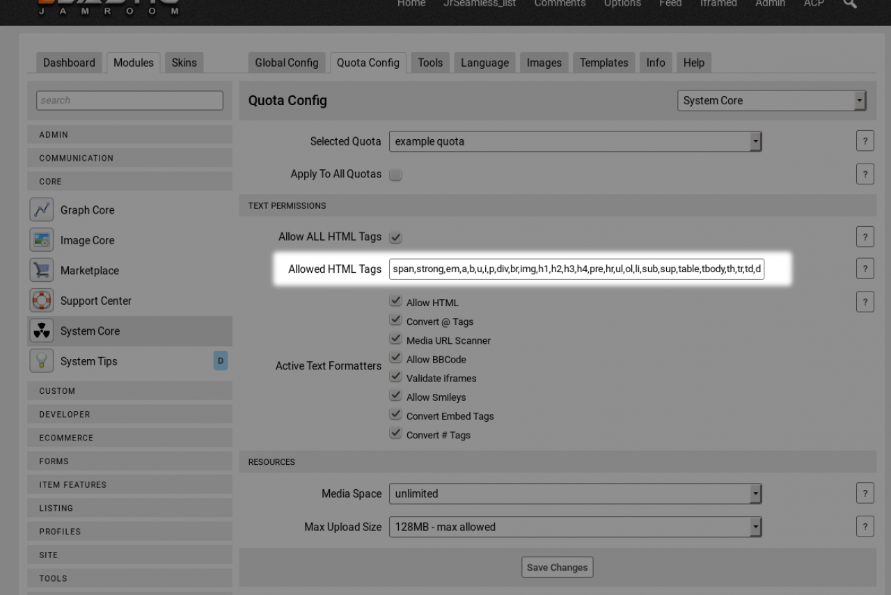 ACP -> CORE -> SYSTEM CORE -> QUOTA CONFIG -> ALLOWED HTML TAGS