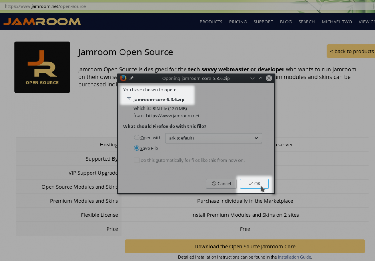 Screenshot of the download dialog to download the jamroom core