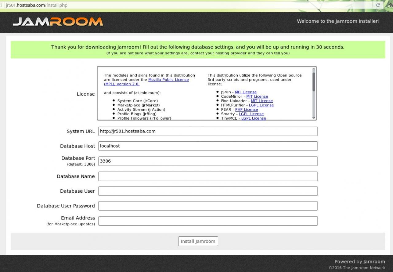 Screenshot of the Install screen for Jamroom CMS