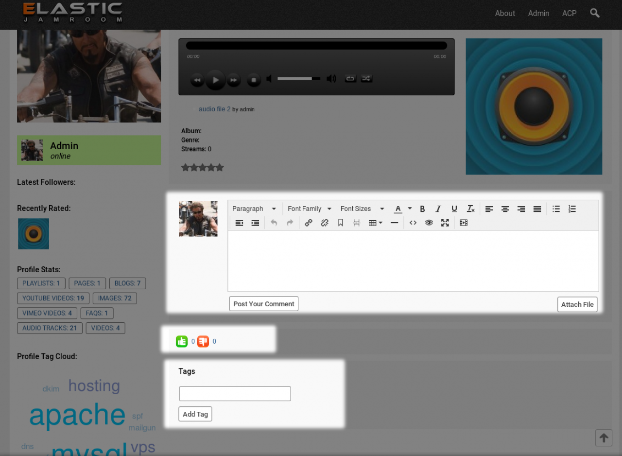 Adding modules like jrTags and jrLike to your system allows users to like and add tags to other modules like an audio file.