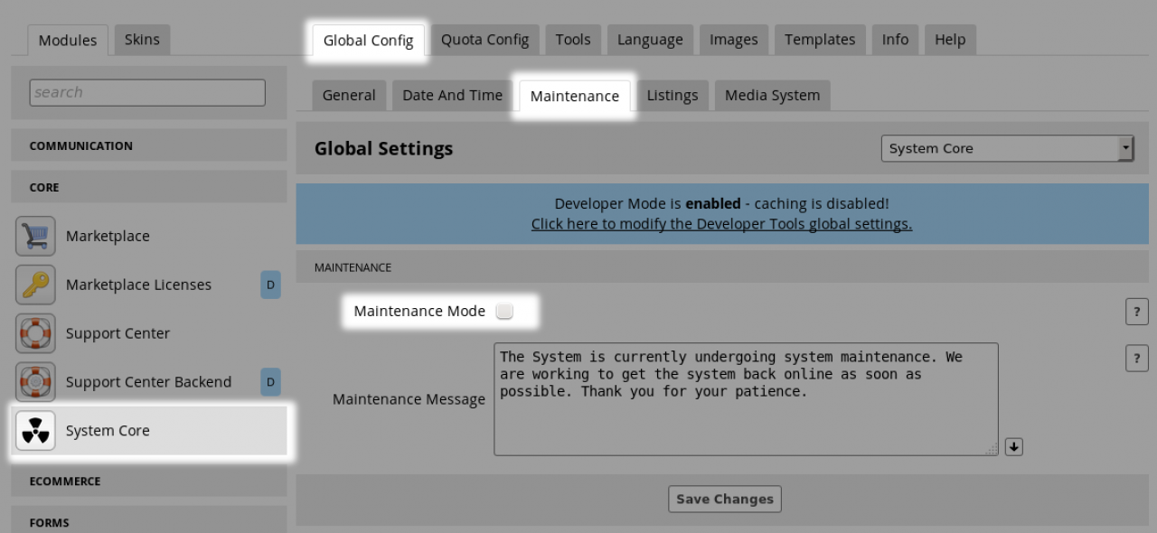 ACP -> CORE -> SYSTEM CORE -> GLOBAL CONFIG -> MAINTENANCE