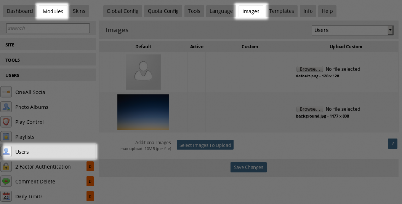 screenshot of the IMAGES tab for the user module