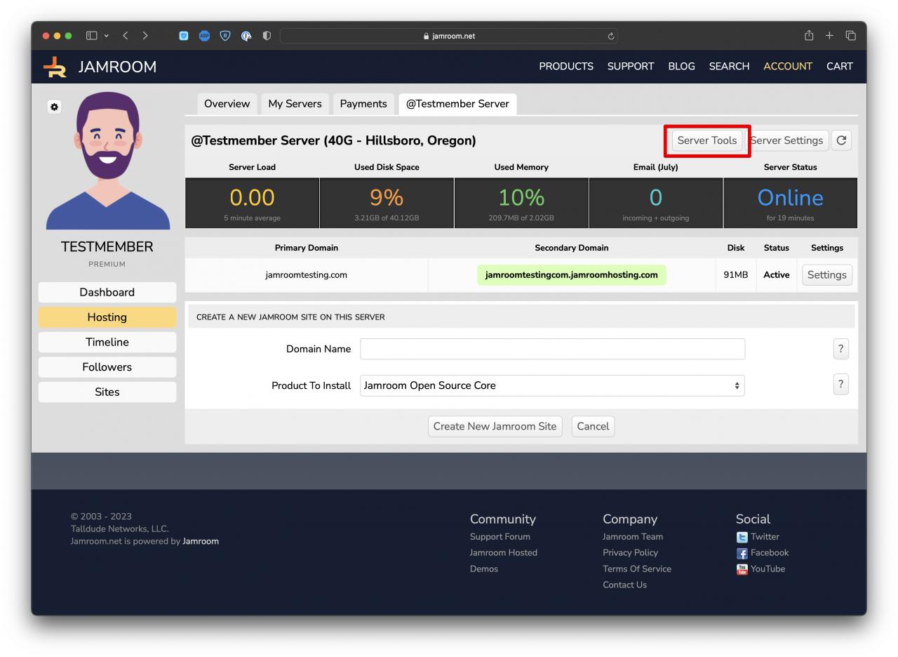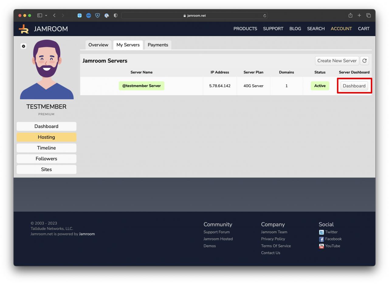 This will take you into the Server Dashboard where you can see the Jamroom Sites that are currently active on the server.