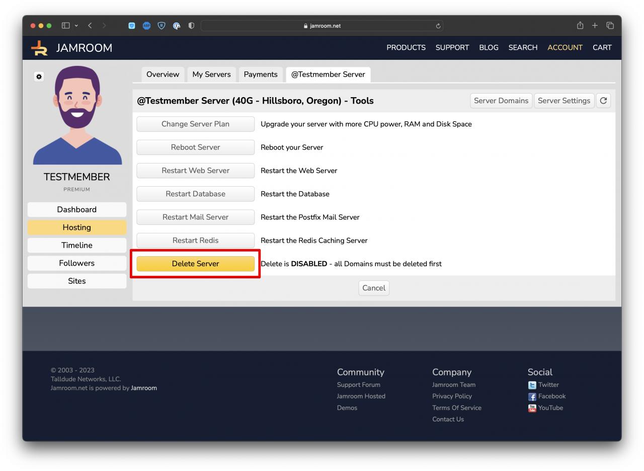 If you decide you no longer wish to use Jamroom Hosting, deleting an existing Jamroom Hosting server is quick and easy - just follow these steps: