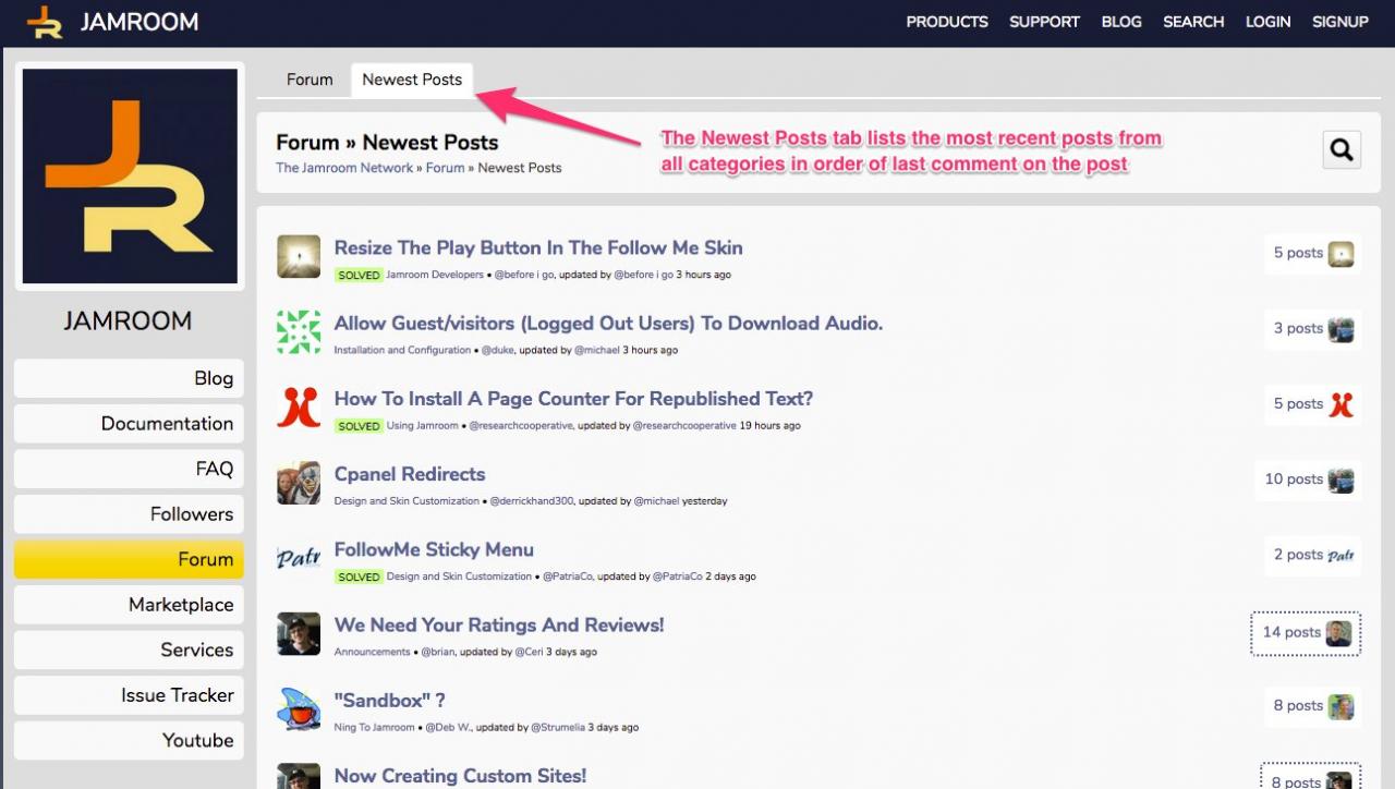 Screenshot of the Newest Posts section of the Support Forums