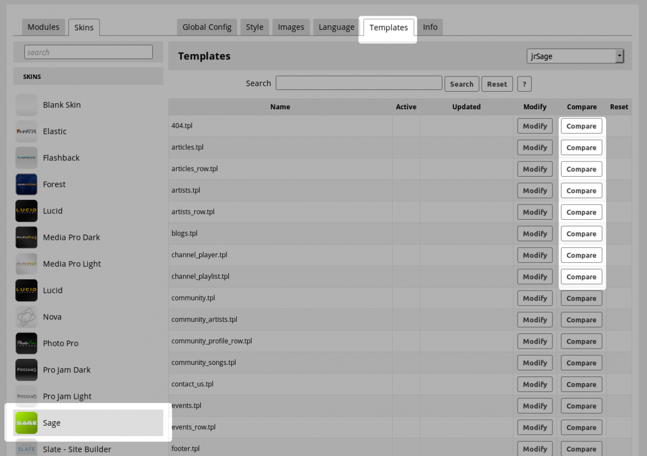 The COMPARE button is on the TEMPLATES tab of the skin you want to know about.