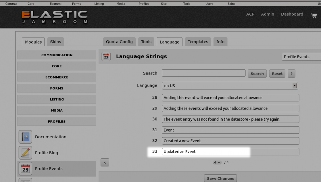 {jrCore_lang} function will try to retrieve the language string from the jrEvent module that is set for id #33.