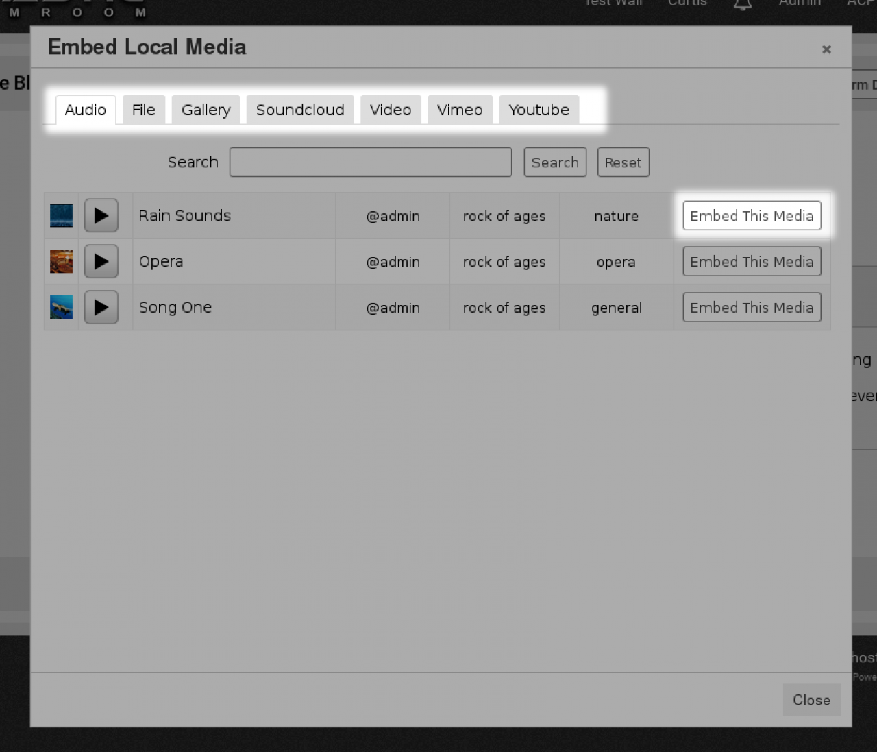 Clicking on that button will popup a dialog in a new window of all the things from your jamroom site that can be added into the page being created.