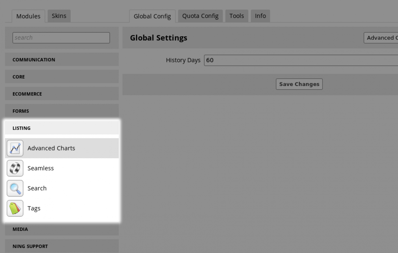 • The listing section of the ACP (Admin Control Panel) houses the modules related listing of items in your site.