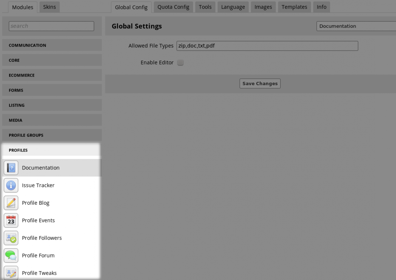 The profiles section of the ACP (Admin Control Panel) houses the modules related options for adding to profiles of items in your site.