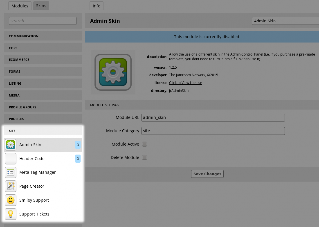 The site section of the ACP (Admin Control Panel) houses the modules that relate to the site as a whole.