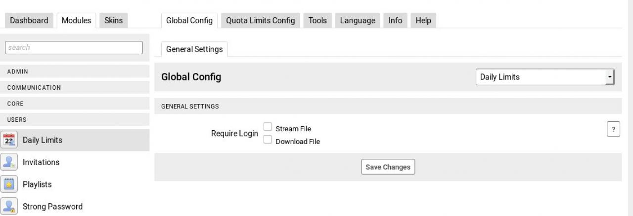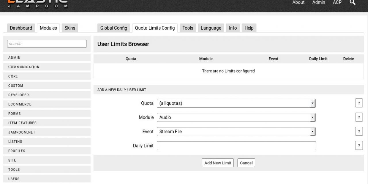 User Daily Limits module allows the admin user to set daily limits on the number of audio and video streams and downloads that a user can perform.