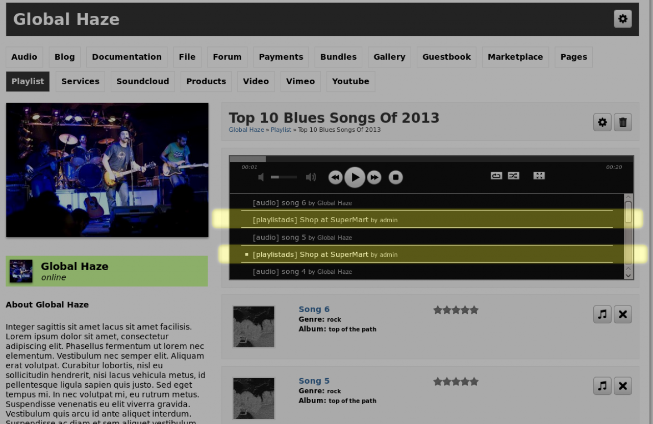 Users create playlists of songs. With this module enabled, the site admin user has the ability to add an audio or video advertisement at intervals in the playlist.