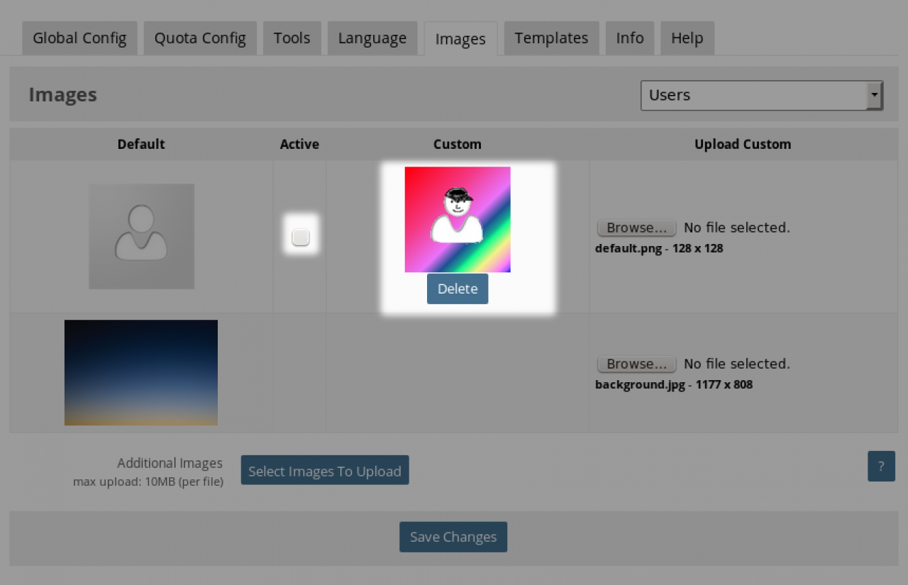 Check the checkbox in the 'Active' column next to the image that has just been uploaded and click the SAVE CHANGES button.