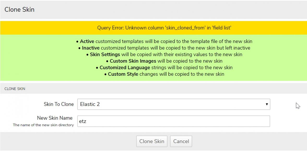 Hi there, I am new to Jamroom, just installed it. I am trying to clone the Elastic 2 skin to be able to customize the cloned one, and I am getting an error ( see attachment). The skin is somehow cloned (name is missing some letters) but I don't know if this error generated missing components of the new skin. Thank you.