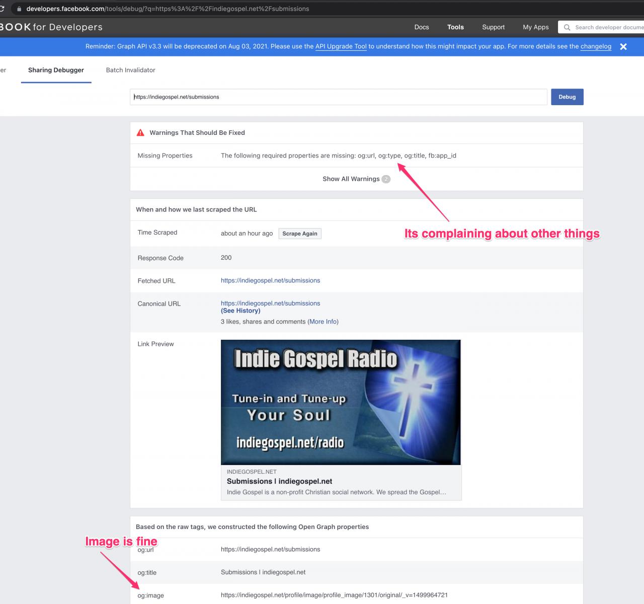 For example, the Facebook Debugger is giving this error on a URL where I used the module to generate tags.