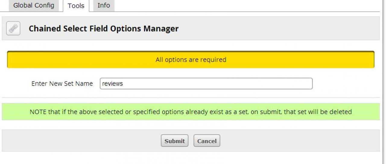Is there a problem in Chained Select Module? I go to ACP->Modules->Chained Select ->Tools->Manage and create a new Set but nothing happens.