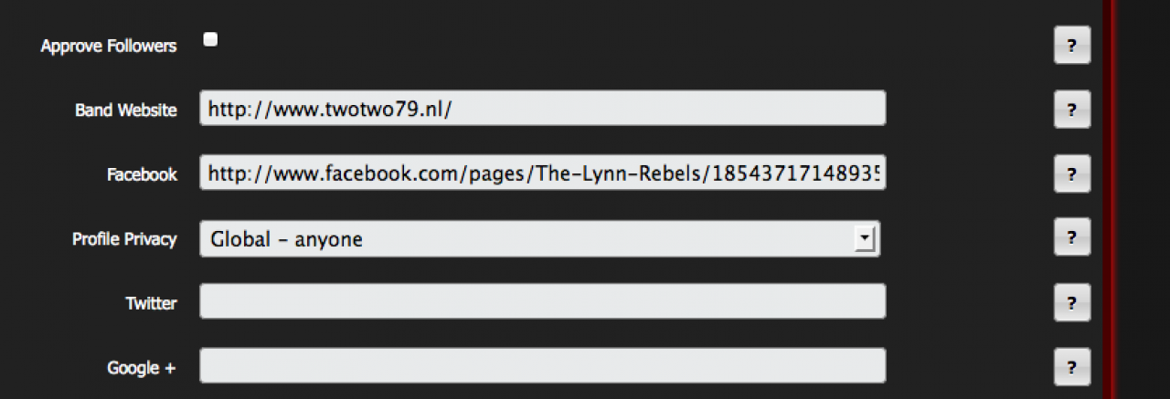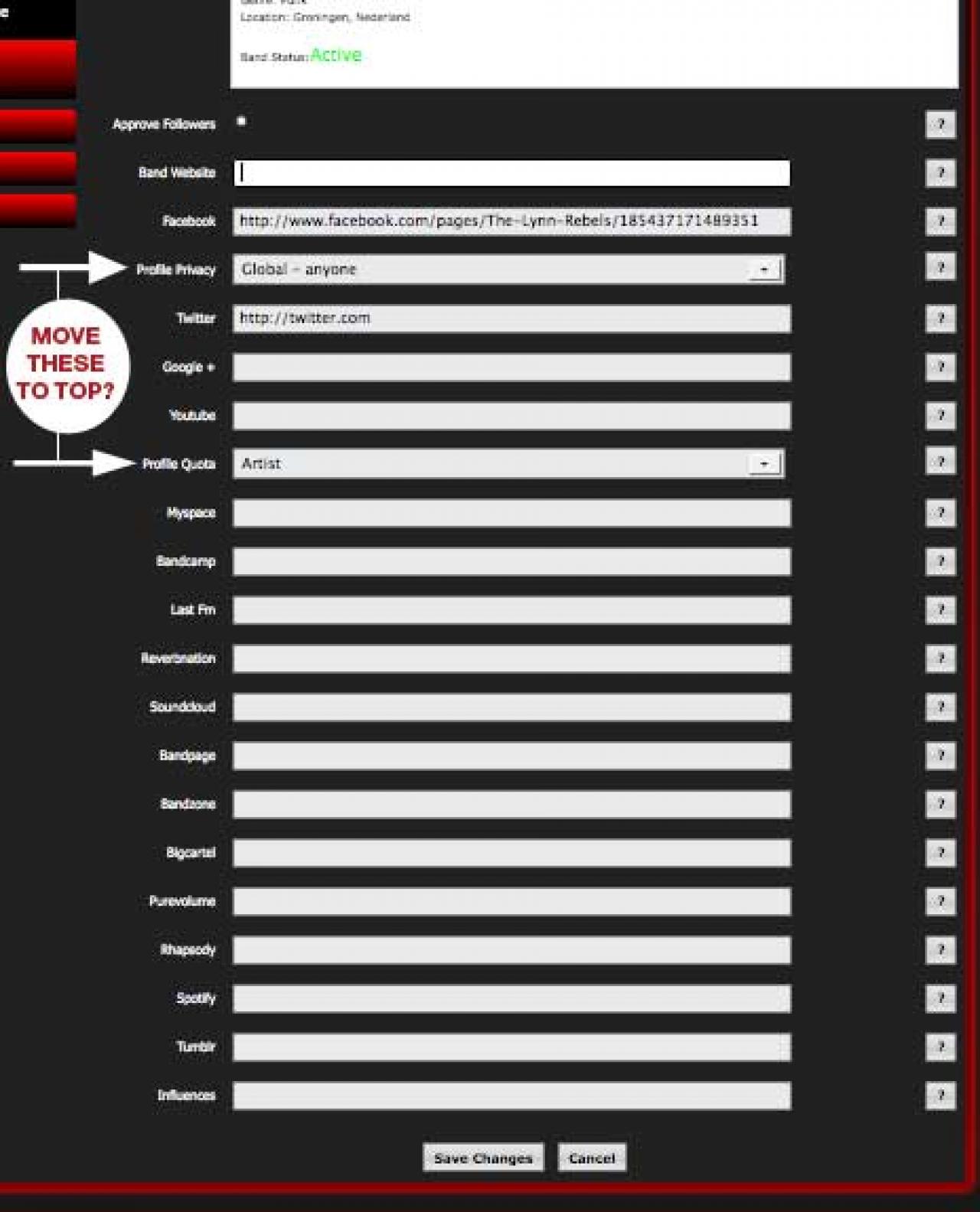 We want to add a form to the profile edit page allowing artists to add social icons to there profile pages
