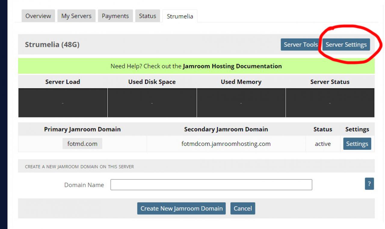I expected to see the "server settings button" on the screen shown in the attached screenshot. But no such thing is there that I can see.