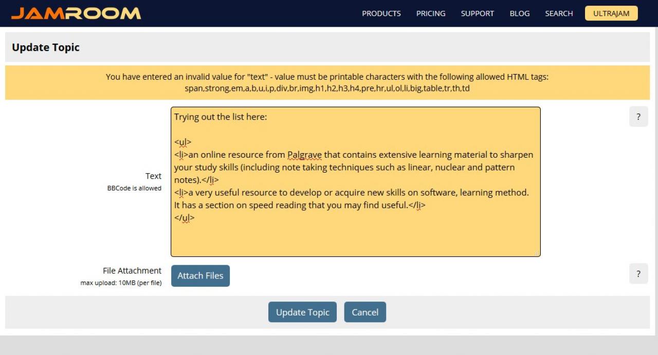 She tries to update a form with a textarea set to validate allowed_html. The text area contains a ul with a class, and links with href and target.