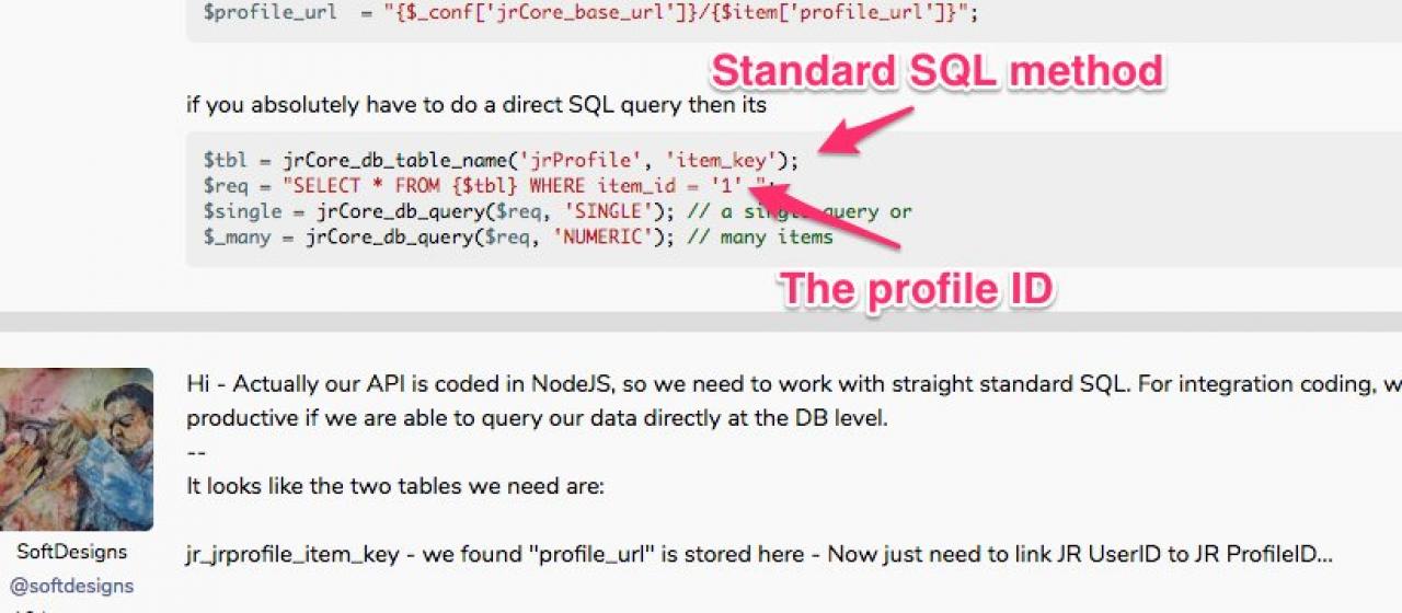 What is the standard SQL to get a user "JR ProfileURL" from UserID ?