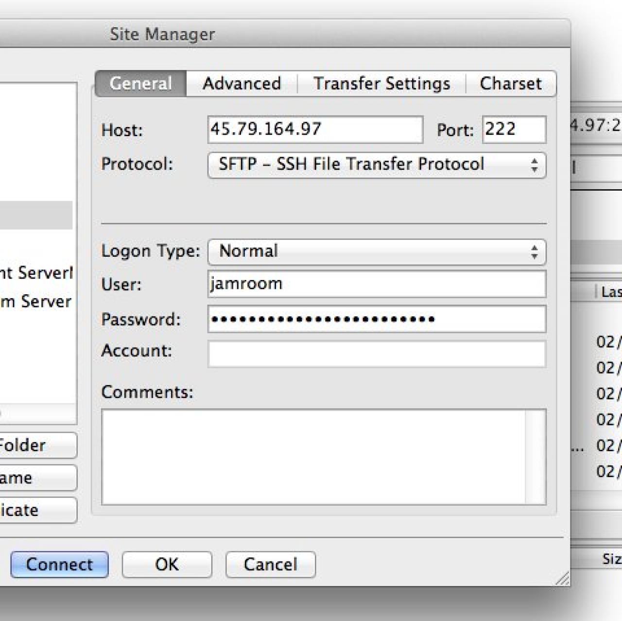 (SFTP Login and Password IP adress & port ) I'm using filezilla and I change the protocol to sftp just says "open "jamroom@45.79.164.97" 222 "