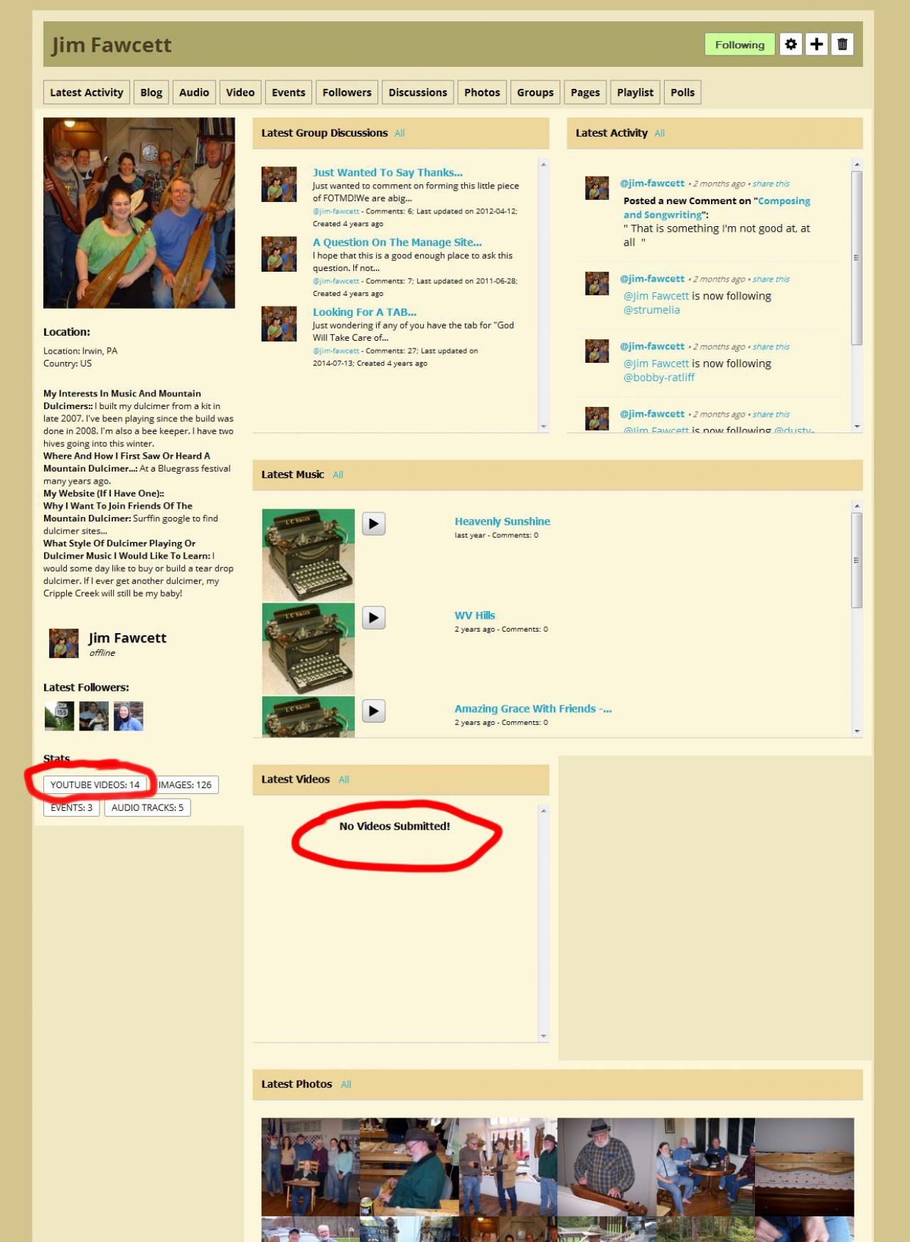 But now, the lovely Videos module content box on profile pages is still 'stuck in the past' and displays ONLY uploaded videos. This creates a confusing conflict. See screenshot- the member has many YT videos on the site, but their "Latest Videos" viewbox says "No Videos Submitted!". Not awesome, in fact would seem downright weird to my members and to new people. Folks will be scratching their heads and asking about it from here to eternity.